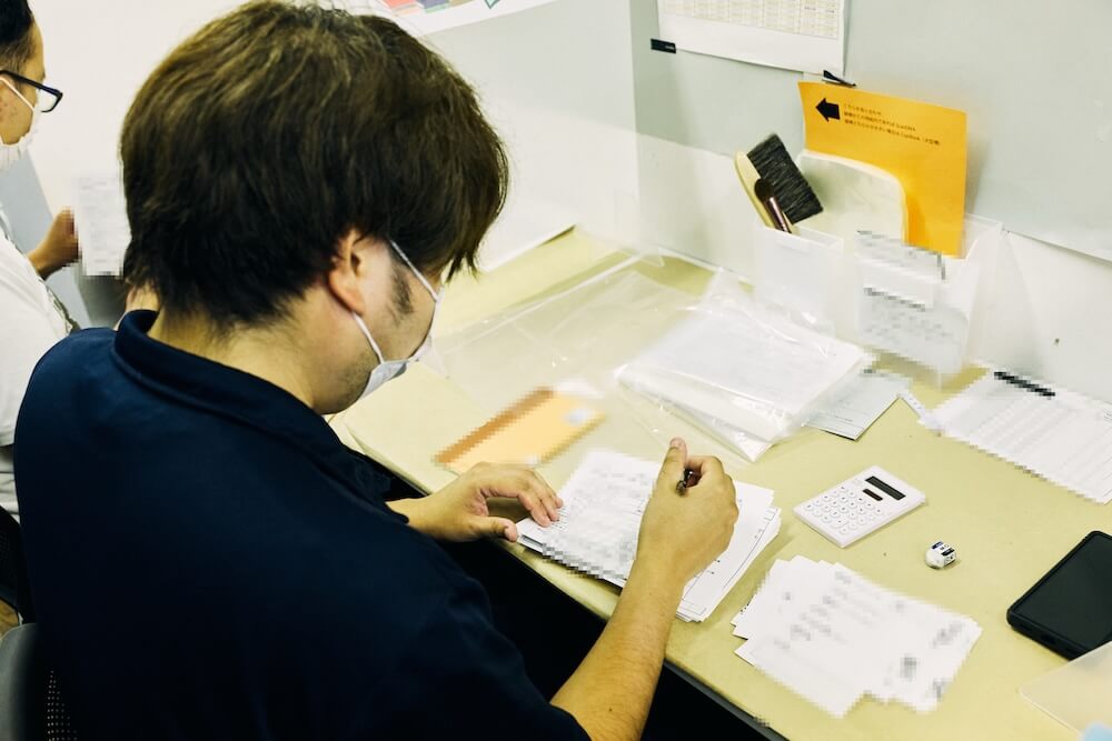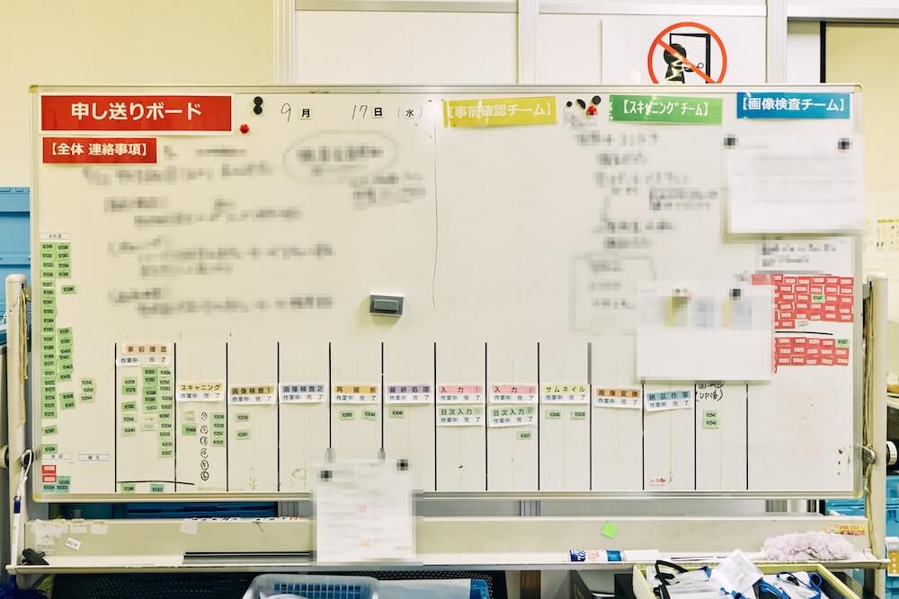 宮地:まずは当初の反省を踏まえ、ホワイトボードを使って作業の工程と進捗状況を「見える化」しました。その内容をもとに毎日朝礼を実施し、例えば「今日は5,000コマ(1コマ=2ページ)やらなくてはいけない」など、作業の課題感を全員で共有して「職員も利用者も一緒に頑張ろう」という雰囲気を醸成していくことにしたんです。