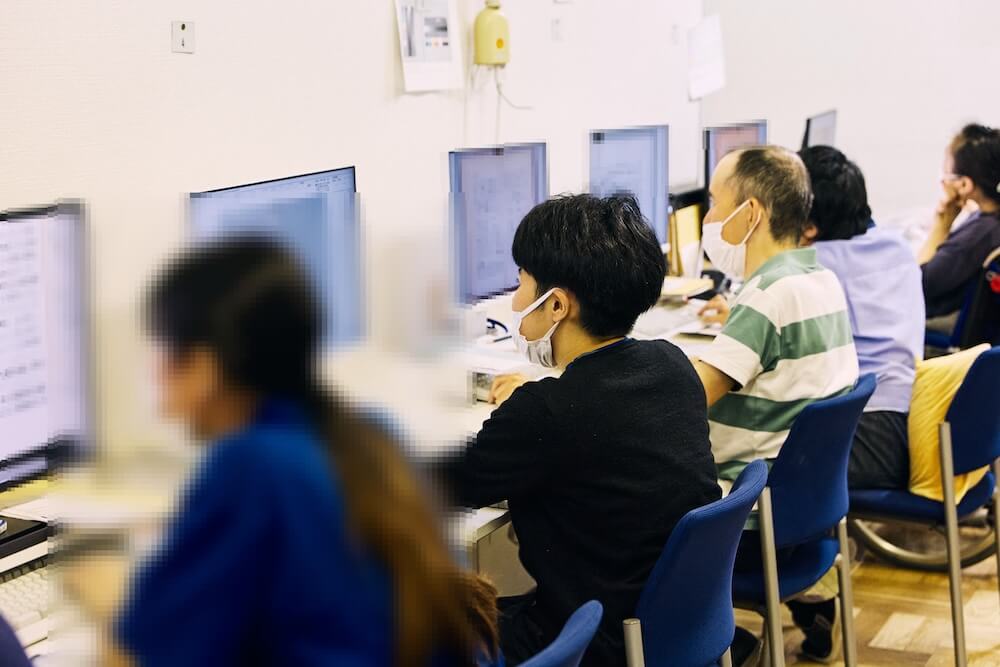本プロジェクトにおいて特徴的なのが、各事業所に作業を割り振り、進捗管理や納品の取りまとめなどを行う「就労支援の場」。複数の事業所が1つの作業場所に集まり、共同でデジタル化作業に取り組む体制です。セルプセンター福岡により現在、県内4ヵ所が運営されています。